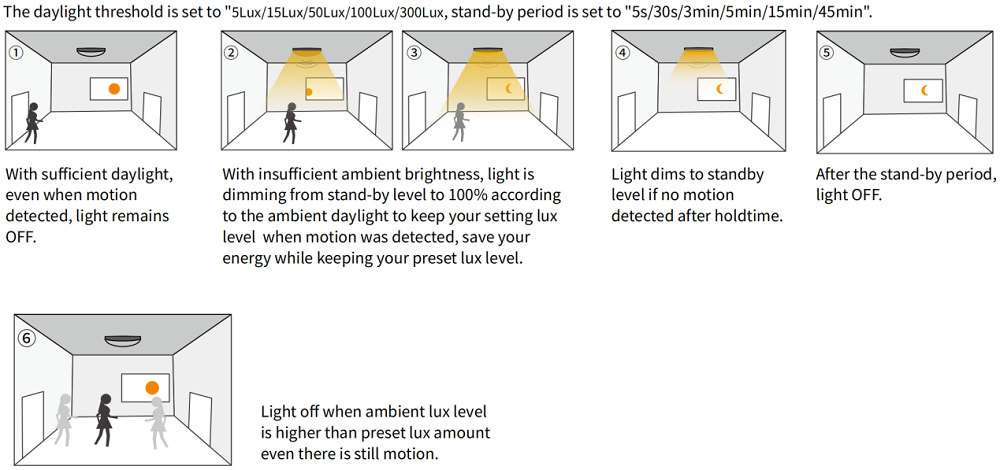 డ్యూయల్-PD టెక్నాలజీకి ధన్యవాదాలు, MC004-S02R సెన్సార్ సహజ కాంతి మరియు కృత్రిమ LED లైట్ మధ్య వ్యత్యాసాన్ని తెలియజేస్తుంది. ఆంబియంట్ లైట్ సెట్టింగ్ విలువ కంటే తక్కువగా ఉన్నప్పుడు సెన్సార్ మీ లైట్ ఫిక్చర్లను ఆన్ చేస్తుంది, అక్కడ కూడా చలనం కనుగొనబడలేదు. పరిసర కాంతి అమరిక విలువకు చేరుకున్నప్పుడు, చలనం ఉన్నప్పటికీ సెన్సార్ లైట్ ఫిక్చర్లను స్విచ్ ఆఫ్ చేస్తుంది.