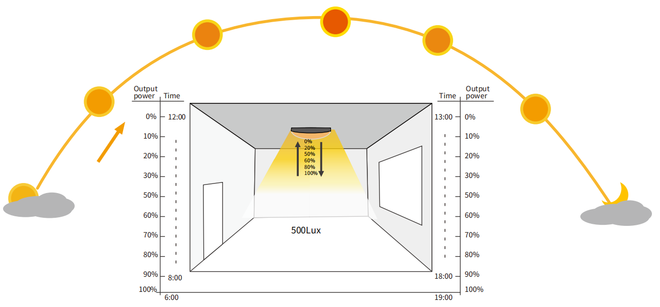 సెన్సార్ ప్రకృతి కాంతిని గుర్తించినప్పుడు, అది కాంతిని మసకబారుతుంది, లైట్ ఫిక్చర్ క్రింది విధంగా అవుట్పుట్ మసకబారుతుంది: