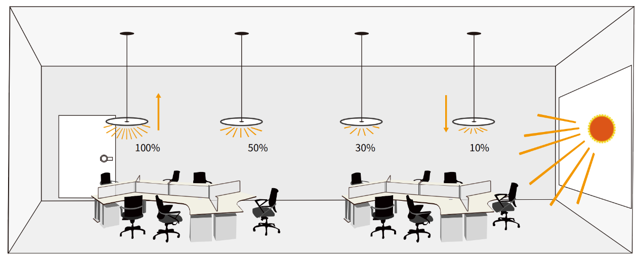 డేలైట్ హార్వెస్టింగ్ - పరిసర కాంతి యొక్క తీవ్రతను స్వయంచాలకంగా గ్రహిస్తుంది మరియు శక్తి వినియోగాన్ని ఆప్టిమైజ్ చేయడానికి దీపాల ప్రకాశాన్ని డైనమిక్గా సర్దుబాటు చేస్తుంది;