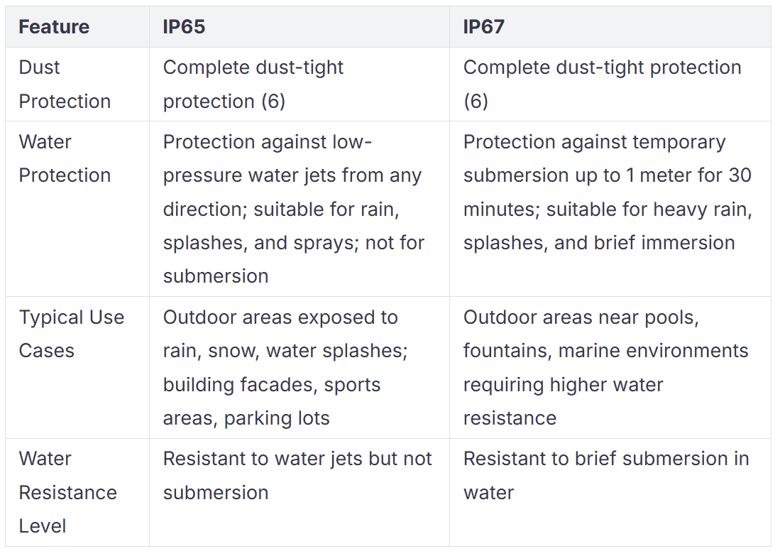 లెడ్ వెదర్ప్రూఫ్ లైటింగ్ను ఎంచుకున్నప్పుడు, అది ఎంత వాటర్ప్రూఫ్ అనే దానిపై దృష్టి పెట్టండి. IP రేటింగ్ కాంతి దుమ్ము మరియు నీటిని ఎంత బాగా ఉంచుతుందో చూపిస్తుంది. చాలా బహిరంగ ప్రదేశాల కోసం, కనీసం IP65 ఉన్న లైట్లను ఎంచుకోండి. ఈ రేటింగ్ మొత్తం ధూళిని అడ్డుకుంటుంది మరియు వర్షం లేదా స్ప్లాష్ల నుండి రక్షిస్తుంది. మీరు సముద్రం సమీపంలో నివసిస్తుంటే లేదా కొలనుల వద్ద లైట్లు ఉంటే, మీకు బలమైన రక్షణ అవసరం. IP67 లైట్లు తక్కువ సమయం పాటు నీటిలో ఉండగలవు. అవి తడి లేదా సముద్ర ప్రాంతాలకు మంచివి.