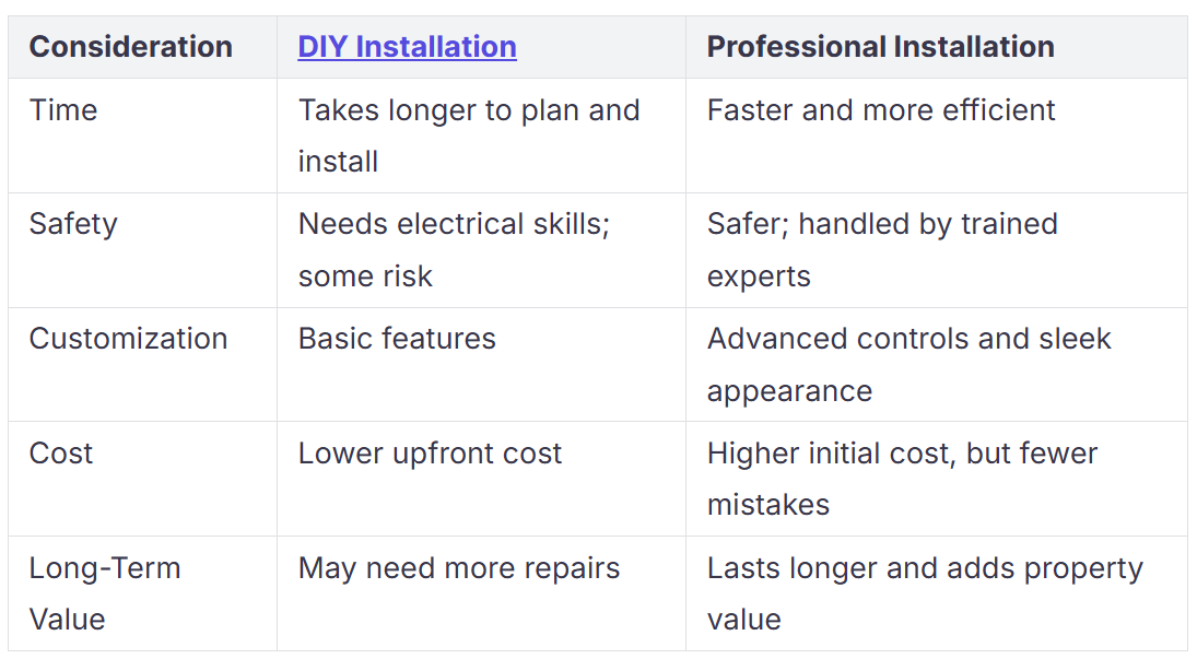 ప్రొఫెషనల్ని పొందడం వల్ల ఎక్కువ ఖర్చు అవుతుంది కానీ మీకు నిపుణుల సహాయాన్ని అందిస్తుంది. నిపుణులు మంచి మెటీరియల్లను ఉపయోగిస్తున్నారు మరియు మీ లైట్లు సురక్షితంగా ఉన్నాయని నిర్ధారించుకోండి. వారు కఠినమైన ఉద్యోగాలు చేయగలరు మరియు ప్రత్యేక లక్షణాలను జోడించగలరు.