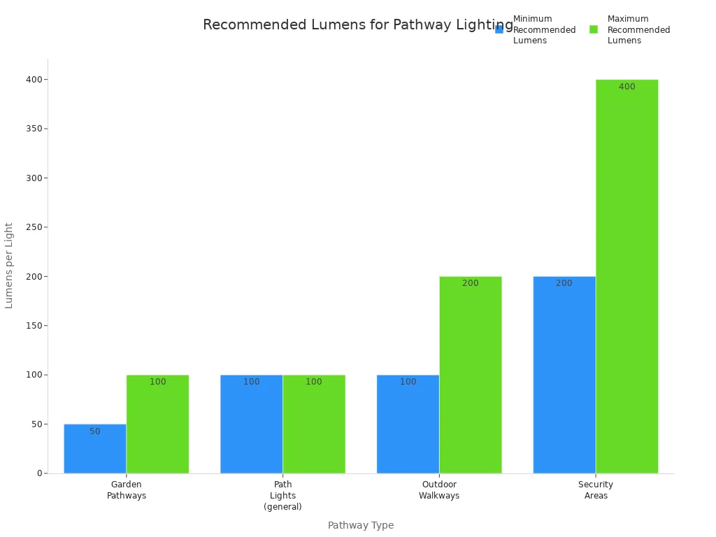 బయట సురక్షితమైన మార్గాలను కలిగి ఉండటం ముఖ్యం. పాత్వే లైటింగ్ ప్రజలు ఎక్కడ నడవాలో చూసేందుకు సహాయపడుతుంది. ఇది ప్రయాణాలు మరియు పతనాలను కూడా ఆపివేస్తుంది. తోట మార్గాల కోసం, 50-100 ల్యూమన్లతో లైట్లను ఉపయోగించండి. మంచి వెలుతురు కోసం నడక మార్గాలకు 100-200 ల్యూమన్లు అవసరం. మీకు మరింత భద్రత కావాలంటే, ఒక్కో లైట్కు 200–400 ల్యూమెన్లను ఉపయోగించండి. ఔట్ డోర్ లెడ్ లైట్లను 6-8 అడుగుల దూరంలో ఉంచండి. ఇరుకైన మార్గాలకు దగ్గరగా లైట్లు అవసరం. విశాలమైన మార్గాల్లో లైట్లు దూరంగా ఉంటాయి. భూమి నుండి 14 అంగుళాల ఎత్తులో లైట్లు ఉంచండి. ఇది నేరుగా పుంజం ఇస్తుంది మరియు మార్గం చక్కగా కనిపిస్తుంది.