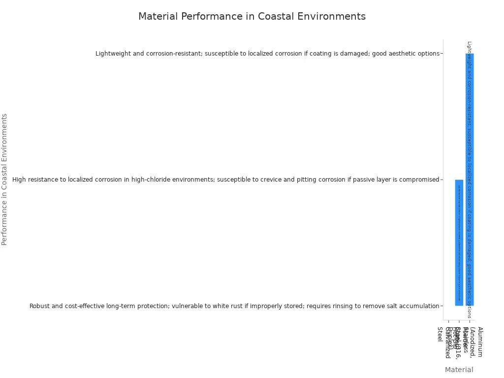 లైట్లు ఎక్కువసేపు ఉండేలా చేయడానికి తయారీదారులు పౌడర్ కోట్ ఫినిష్లు మరియు సీల్డ్ కవర్లను ఉపయోగిస్తారు. ఈ ఫీచర్లు లీడ్ వెదర్ ప్రూఫ్ లైటింగ్ తుఫానులు, తడి గాలి మరియు సాల్ట్ స్ప్రేని తట్టుకోవడంలో సహాయపడతాయి. దిగువ చార్ట్లో సముద్రం దగ్గర వివిధ పదార్థాలు ఎలా పని చేస్తాయో మీరు చూడవచ్చు: