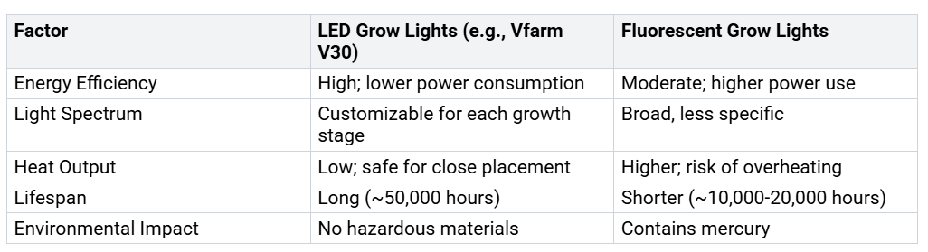 మీరు LED గ్రో లైట్లను ఫ్లోరోసెంట్ ఎంపికలతో పోల్చినప్పుడు, మీరు స్పష్టమైన ప్రయోజనాలను చూస్తారుశక్తి సామర్థ్యం, మొక్కల ఆరోగ్యం మరియు నిర్వహణ. FANXSTAR Vfarm V30 వంటి LEDలు అనుకూలీకరించదగిన కాంతి స్పెక్ట్రమ్లు, ఎక్కువ జీవితకాలం మరియు సురక్షితమైన ఆపరేషన్ను అందిస్తాయి. T5 ట్యూబ్ల వంటి ఫ్లోరోసెంట్ లైట్లు ఎక్కువ శక్తిని ఉపయోగిస్తాయి, ఎక్కువ వేడిని ఉత్పత్తి చేస్తాయి మరియు తక్కువ జీవితకాలం కలిగి ఉంటాయి. అవి పాదరసం వంటి ప్రమాదకరమైన పదార్థాలను కూడా కలిగి ఉంటాయి, వీటికి ప్రత్యేక పారవేయడం అవసరం.
