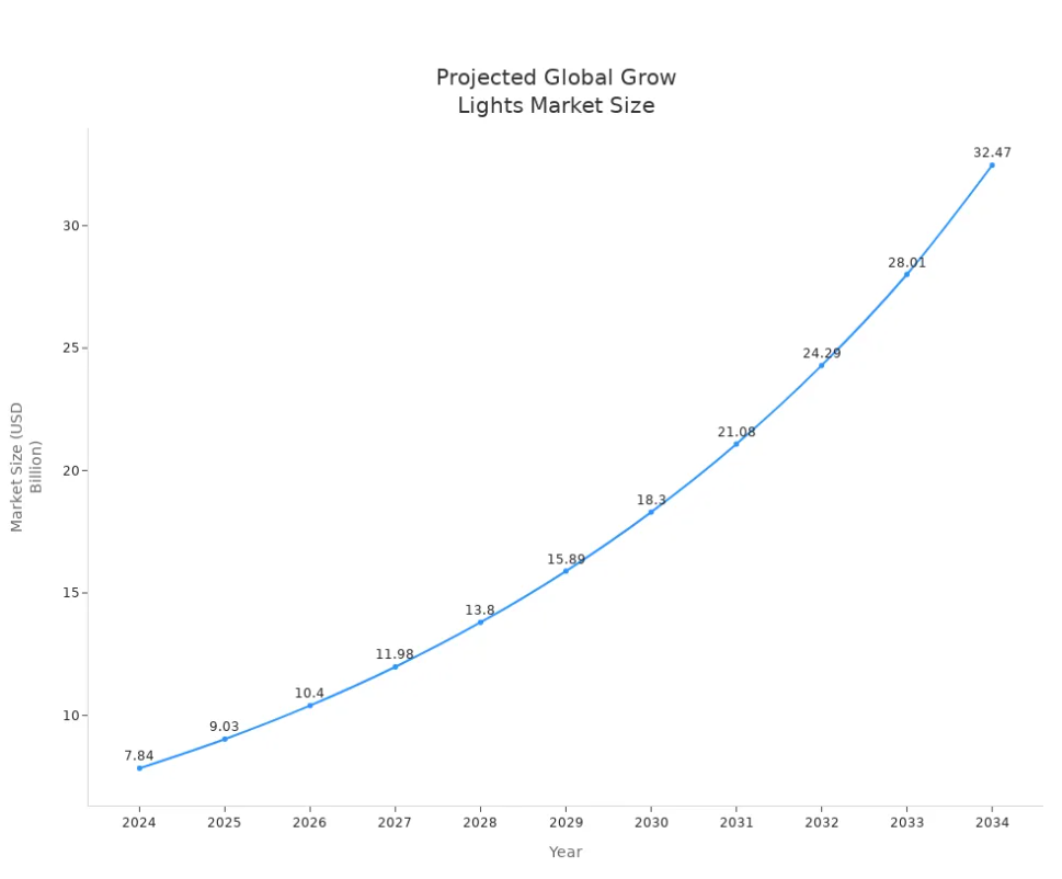 అవును, వర్టికల్ గ్రో లైట్లు మీ మొక్కలు మెరుగ్గా పెరగడంలో సహాయపడతాయి. మీరు చూడండిఇండోర్ గార్డెనింగ్లో వేగవంతమైన మార్పులుమెరుగైన మొక్కల పెరుగుదల కోసం ఎక్కువ మంది ప్రజలు అధునాతన గ్రో లైట్లను అనుసరిస్తారు. ఇటీవలి పోకడలు చూపిస్తున్నాయిఉత్తర అమెరికా మరియు ఆసియా-పసిఫిక్ వంటి ప్రాంతాలలో నిలువు వ్యవసాయంసమర్థవంతమైన, సంవత్సరం పొడవునా ఉత్పత్తి కోసం LED సాంకేతికతపై ఆధారపడుతుంది. FANXSTAR Vfarm V30 వంటి కొత్త పరిష్కారాలు శక్తి సామర్థ్యాన్ని మరియు అనుకూలీకరించదగిన ఎంపికలను అందిస్తాయి, ఆధునిక సాగుదారులకు నిలువుగా పెరిగే లైట్లు అవసరం.