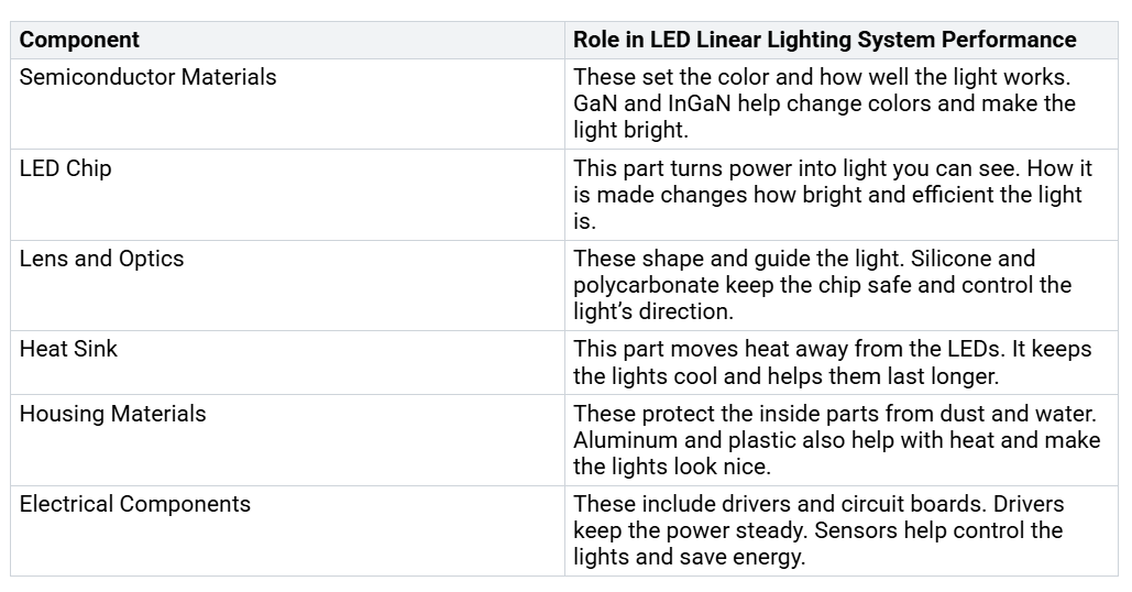 LED లీనియర్ లైటింగ్ పెద్ద ప్రదేశాలలో ప్రకాశవంతమైన కాంతిని ఇవ్వడానికి ప్రత్యేక భాగాలను ఉపయోగిస్తుంది. ప్రతి భాగం లైట్లు బాగా పని చేయడానికి మరియు ఎక్కువసేపు ఉండటానికి సహాయపడుతుంది. దిదిగువ పట్టిక ప్రధాన భాగాలను మరియు అవి ఏమి చేస్తుందో చూపిస్తుంది: