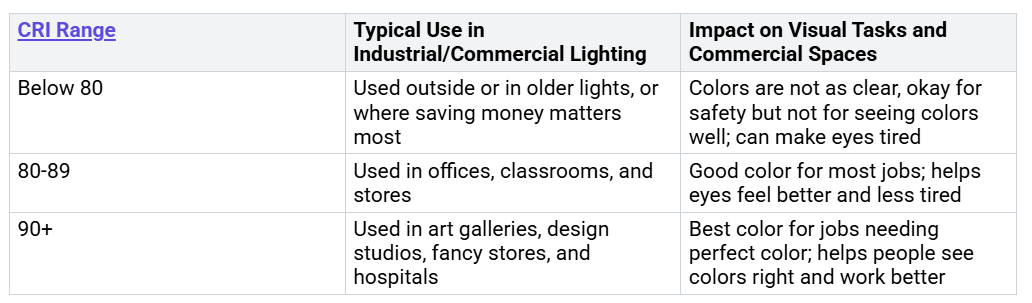 పొడవైన, సన్నని ఫిక్చర్లలో LED లుకాంతిని అందించడంలో సహాయపడండి. ఇది మీ కళ్లను సులభతరం చేస్తుంది మరియు మీరు మెరుగ్గా చూడడంలో సహాయపడుతుంది. వ్యాపారాలలో, రంగు ఖచ్చితత్వం ముఖ్యం. ఇండస్ట్రియల్ లీనియర్ లైటింగ్ సాధారణంగా a కలిగి ఉంటుందిCRI 80 మరియు 90 మధ్య. చాలా ఉద్యోగాలకు 80 లేదా అంతకంటే ఎక్కువ CRI మంచిది. రంగు ఖచ్చితంగా ఉండే ప్రదేశాలకు 90 లేదా అంతకంటే ఎక్కువ CRI ఉత్తమం. అధిక CRI అంటే మెరుగైన రంగు, మరింత సౌకర్యం మరియు సురక్షితమైన పని. ఇది ప్రజలు తమ పనులను మెరుగ్గా చేయడానికి సహాయపడుతుంది.