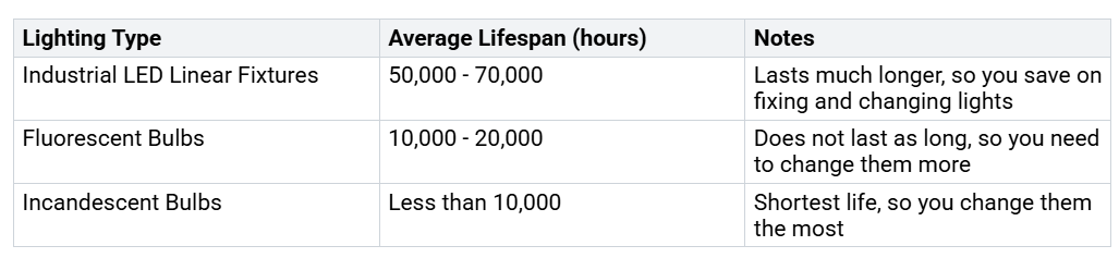 పారిశ్రామిక లీనియర్ లైటింగ్ చాలా కఠినమైనది మరియు చాలా కాలం పాటు ఉంటుంది. LED ఫిక్చర్లు ఇతర బల్బుల కంటే ఎక్కువ కాలం ఉంటాయి. చాలా పారిశ్రామిక LED లీనియర్ ఫిక్చర్లు చివరిగా ఉంటాయి50,000 నుండి 70,000 గంటలు.ఫ్లోరోసెంట్ బల్బులు 10,000 నుండి 20,000 గంటల వరకు మాత్రమే ఉంటాయి. ప్రకాశించే బల్బులు 10,000 గంటల కంటే తక్కువగా ఉంటాయి. దీని అర్థం మీరు వాటిని తరచుగా మార్చాల్సిన అవసరం లేదు, ఇది సమయం మరియు డబ్బు ఆదా చేస్తుంది.