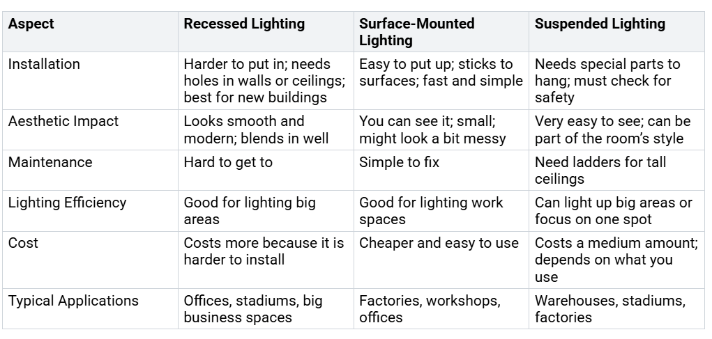 ఉపరితల-మౌంటెడ్ లీనియర్ లైటింగ్ నేరుగా పైకప్పులు లేదా గోడలపైకి వెళుతుంది. ఈ రకం వ్యాపారాలలో ఎక్కువగా ఉపయోగించబడుతుంది. 2023 లో, ఇది ఏర్పడిందిమార్కెట్లో సగానికి పైగా.చాలా కంపెనీలు దీనిని ఎంచుకుంటాయి ఎందుకంటే ఇది ఉంచడం సులభం మరియు చౌకగా ఉంటుంది. ఈ లైట్లు మరింత కాంతిని ఇస్తాయి మరియు కార్యాలయాలు, వర్క్షాప్లు మరియు గ్యారేజీలలో బాగా పని చేస్తాయి. మీరు వాటిని చేరుకోవచ్చు కాబట్టి వాటిని పరిష్కరించడం సులభం. మీకు వేగవంతమైన మరియు సులభమైన సెటప్ అవసరమయ్యే ప్రదేశాలకు ఈ రకం ఉత్తమమైనది.