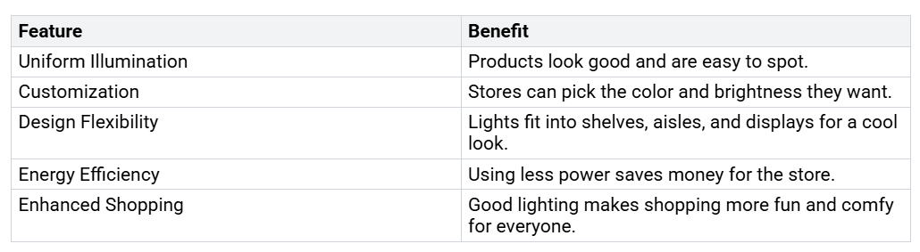 స్టోర్లు ఉత్పత్తులను ప్రదర్శించడానికి మరియు షాపింగ్ను సరదాగా చేయడానికి లీనియర్ లైటింగ్ను ఉపయోగిస్తాయి. ప్రకాశవంతంగా, కాంతి కూడా కస్టమర్లు ప్రతిదీ స్పష్టంగా చూడడంలో సహాయపడుతుంది. చీకటి మచ్చలు లేదా కఠినమైన నీడలు లేవు. దిలీనియర్ లైటింగ్ స్టోర్లకు ఎలా సహాయపడుతుందో దిగువ పట్టిక చూపిస్తుంది: